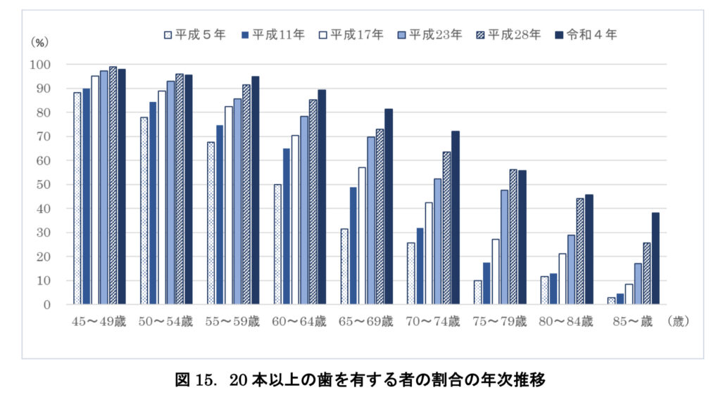 平成5年の結果と比べると、歯が残っている人の割合は上昇しています。